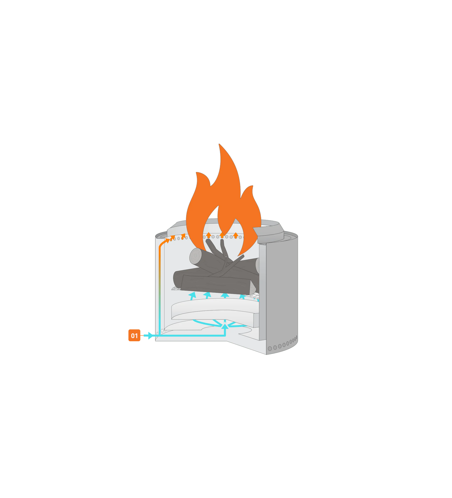 Otwory wentylacyjne znajdujące się w górnej części komory spalania umożliwiają dopływ wstępnie ogrzanego tlenu do płomienia, co zapewnia pełniejsze spalanie, gorętszy ogień i mniej dymu.